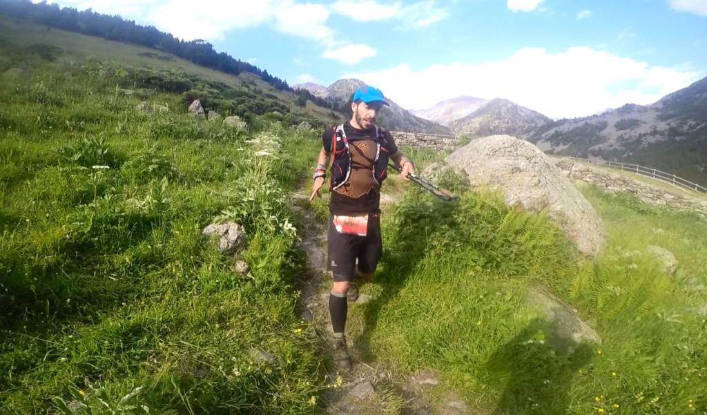 Empezamos a correr por las calles de Ordino hasta adentrarnos en un pequeño camino forestal. Teniamos 20 km hasta el siguiente punto de avituallamientos, pero teníamos que hacerle frente a un desnivel de 1500 metros. Me lo tome con tranquilidad pero sin perder el ritmo. Tras enfrentarme a una subida de 12 kilómetros tenía la sensación de que se me subían los gemelos. Podía ser por la sobrecarga de la semana anterior. En ese momento me preocupe muchísimo, porque veía peligrar mi continuidad en la prueba y esta no había hecho más que empezar. Emprendí el descenso y llegue al punto de avituallamiento de Sorteni, tras 3 horas. Allí estaban mis amigos, a los que trasmití mis preocupaciones. Decidí utilizar las medias de compresión que no suelo utilizar, y si, acerté!! De ahí en adelante las sensaciones, incluso mi cara cambió. Pase en el puesto 38 por ese punto.