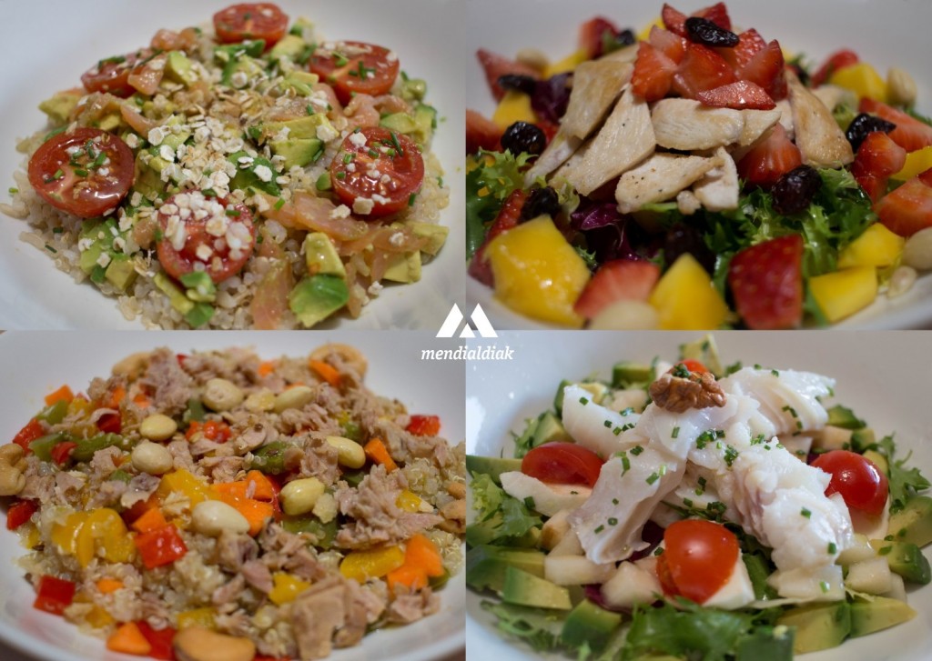 Oro har, freskoak egin ditut denak, pentsatzen nabil entsaladen bigarren zati bat egitea, baina beno hori zuek erabakiko duzue, ea zer deritzozuen. Entsaladak mota askotakoak izan daitezke, eta denok egiten ditugu. Bakoitzak bere erara. Batzuei teknika eta osagai berriak erabiltzea gustatzen zaie, beste batzuek, ordea, betikora jotzen dute. Horrexegatik, kirolarion egunerokoan ezinbesteko diren entsaladen bertsio desberdinak dakarzkizuet gaurkoan, ideia barik zabiltzatenean hona jo dezazuen edota gogorik gabe zabiltzaten une horiek kolorez jantzi ditzagun.
